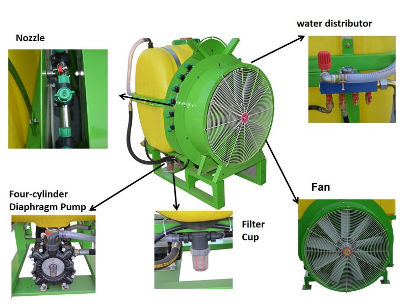 Den monterade trädgårdssprutan är en stor maskin som är lämplig för att spruta bekämpningsmedel i stora fruktträdgårdar. Det har fördelarna med god spraykvalitet, låg användning av bekämpningsmedel, låg vattenanvändning och hög produktionseffektivitet. Dessutom förlitar det sig inte enbart på trycket från vätskepumpen för att fina vätskemedicinen, utan förlitar sig på fläkten för att generera ett starkt luftflöde för att blåsa dropparna till olika delar av fruktträdet. Fläktens höghastighetsluftflöde hjälper dropparna att tränga in de täta grenarna och bladen på fruktträdet, och får också bladen att vända, vilket ökar vidhäftningshastigheten för vätskemedicinen utan att skada grenarna på fruktträd eller frukt.